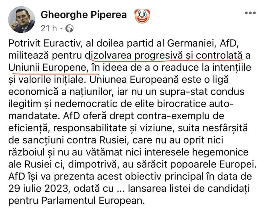 Anti FakeNewsAUR / Alin Mituța, europarlamentar Renew Europe: “Personajul din imagine, viitor candidat AUR la europarlamentare, face apologia partidului extremist neo-nazist AfD, un partid care jignește constant românii și al cărui europarlamentar spunea acum câteva luni de la tribuna Parlamentului European că România e vestul sălbatic al Europei și că nu are ce căuta nici în Schengen, nici în UE.