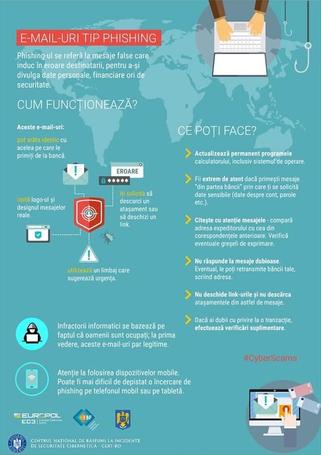 CERT-RO: “Noi capcane de tip phishing/scam raportate de urmăritorii CERT-RO către paginile noastre de social media. Mulțumim tuturor pentru contribuție și avem rugămintea să transmiteți aceste date nu doar în mesaj privat, ci și la adresa alerts@cert.ro, ori la numărul de urgență 1911, pentru a vă înregistra instant notificarea și a începe o investigație în acel caz!
