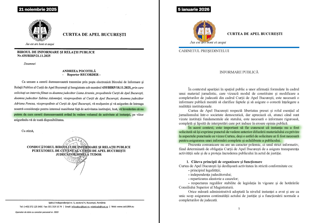 După celebra conferință de presă organizată pe 11 decembrie și transformată într-un fiasco, conducerea Curții de Apel București (CAB) mai face o încercare de a-și spăla imaginea. Într-un comunicat emis ieri seară, președinta CAB, Liana Arsenie, acuză Recorder că a creat o emoție publică „artificială și periculoasă” și că a decredibilizat instanța pe care o conduce. În mod șocant, comunicatul prin care Curtea de Apel București încearcă să-și recupereze credibilitatea afectată conține, însă, o serie de minciuni și de manipulări prin omisiune. Le vom detalia mai jos. Cum să refuzi dialogul, iar apoi să te plângi că nu ți se cere punctul de vedere Comunicatul întins pe zece pagini (poate fi citit integral aici) începe cu o minciună flagrantă: „Este important să fie cunoscut că instanța nu a fost solicitată să își exprime punctul de vedere anterior difuzării materialului cu privire la aspectele punctuale ce vizau Curtea, deși o astfel de… Read More
