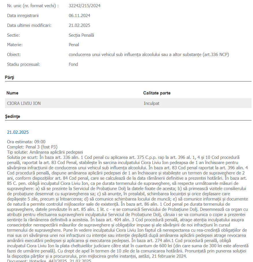 Directorul Departamentului Statistică și Informatică Economică din cadrul Facultății de Economie și Administrarea Afacerilor – Universitatea din Craiova, conferențiar universitar doctor Liviu Ion Ciora, a fost condamnat, astăzi, la un an de închisoare, cu amânarea aplicării pedepsei. Cadrul universitar a fost trimis în judecată în noiembrie 2024 pentru conducerea unui vehicul sub influența alcoolului sau a altor substanţe. Sentința Judecătoriei Craiova poate fi atacată cu apel: ”(…) Stabileşte în sarcina inculpatului Ciora Liviu Ion pedeapsa de 1 an închisoare pentru săvârşirea infracţiunii de conducerea unui vehicul sub influenţa alcoolului. (…) dispune amânarea aplicării pedepsei de 1 an închisoare şi stabileşte un termen de supraveghere de 2 ani (…) care se calculează de la data rămânerii definitive a prezentei hotărâri. (…) Obligă inculpatul Ciora Liviu Ion la plata cheltuielilor judiciare către stat în cuantum de 600 lei (din care suma de 300 lei este aferentă fazei de urmărire penală). Cu drept… Read More