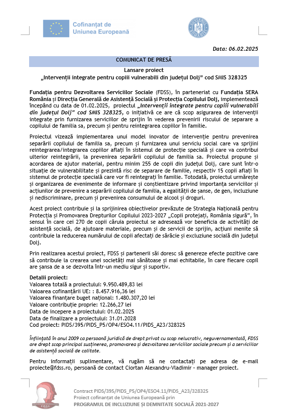 Fundația pentru Dezvoltarea Serviciilor Sociale (FDSS), în parteneriat cu Fundația SERA România și Direcția Generală de Asistență Socială și Protecția Copilului Dolj, implementează începând cu data de 01.02.2025, proiectul „Intervenții integrate pentru copiii vulnerabili din județul Dolj” cod SMIS 328325, o inițiativă ce are ca scop asigurarea de intervenții integrate prin furnizarea serviciilor de sprijin în vederea prevenirii riscului de separare a copilului de familia sa, precum și pentru reintegrarea copiilor în familie. Proiectul vizează implementarea unui model inovator de intervenție pentru prevenirea separării copilului de familia sa, precum și furnizarea unui serviciu social care va sprijini reintegrarea/integrarea copiilor aflați în sistemul de protecție specială și care va contribui ulterior reintegrării, la prevenirea separării copilului de familia sa. Proiectul propune și acordarea de ajutor material, pentru minim 255 de copii din județul Dolj, care sunt într-o situație de vulnerabilitate și prezintă risc de separare de familie, respectiv 15 copii aflați… Read More